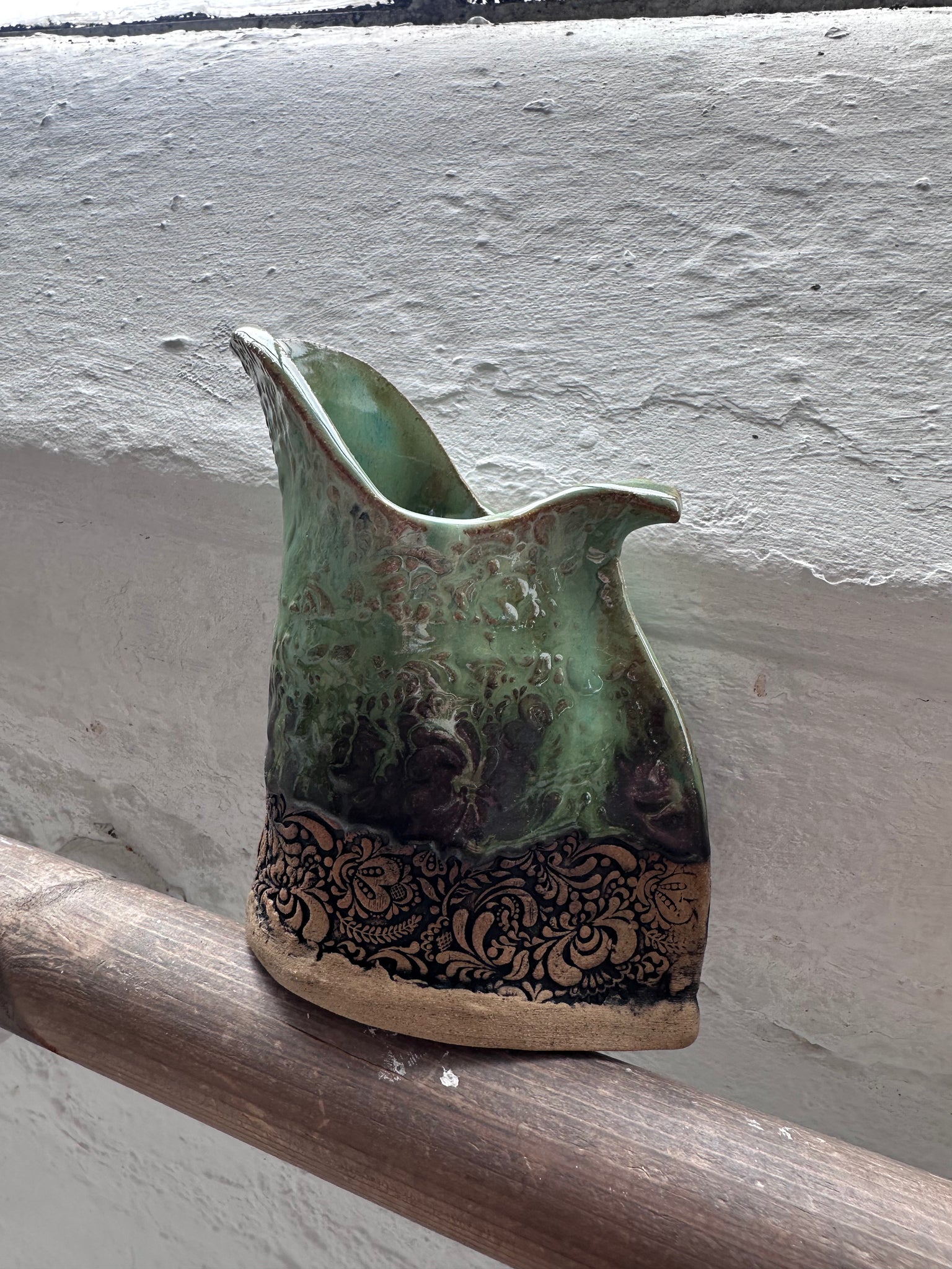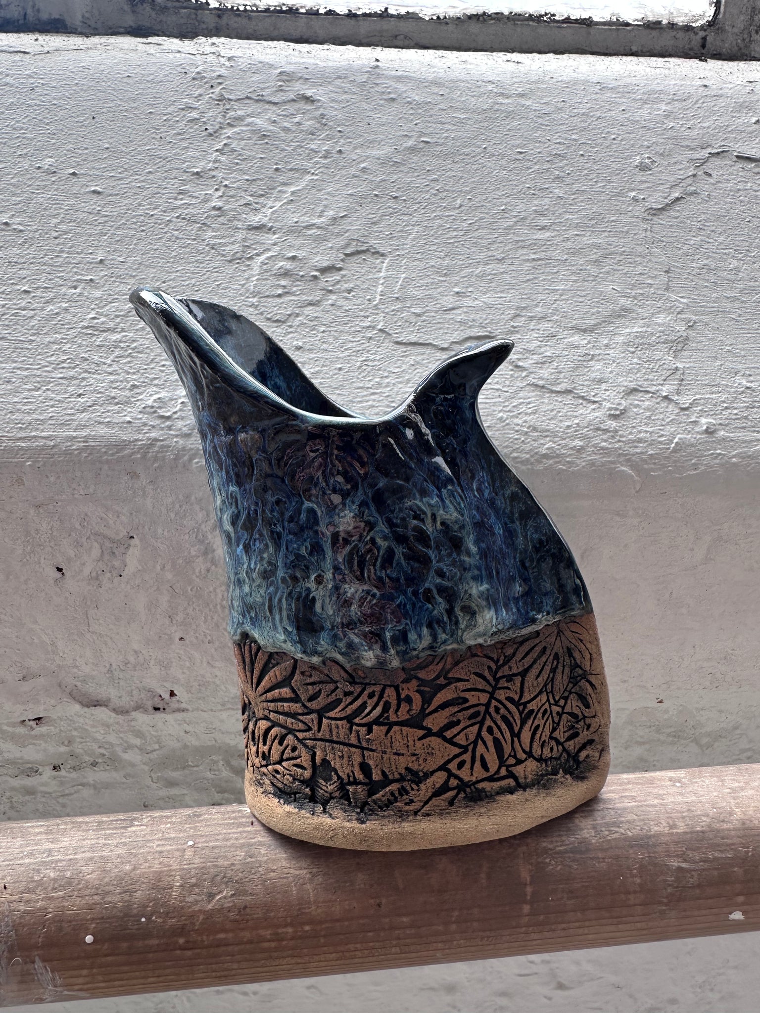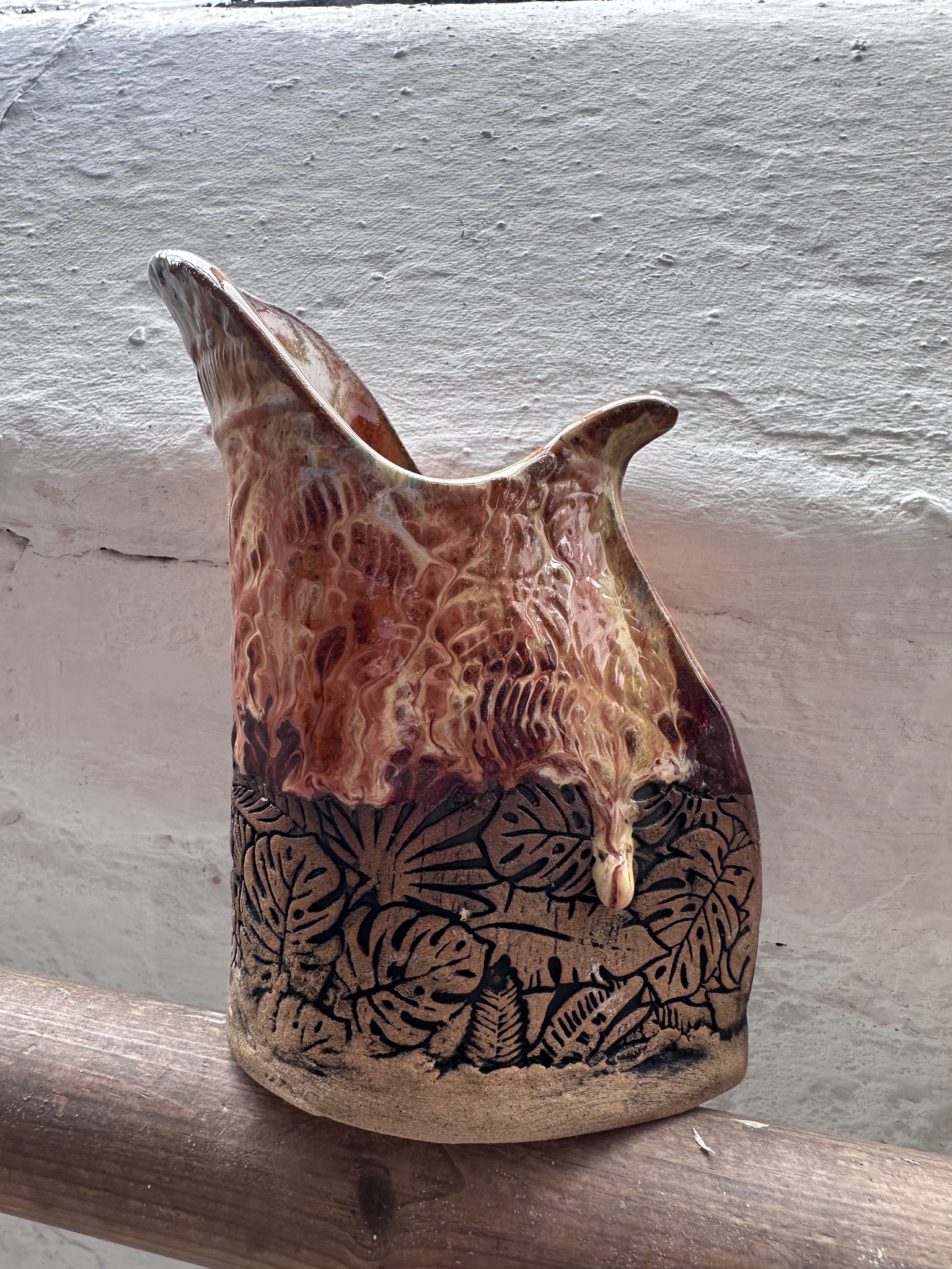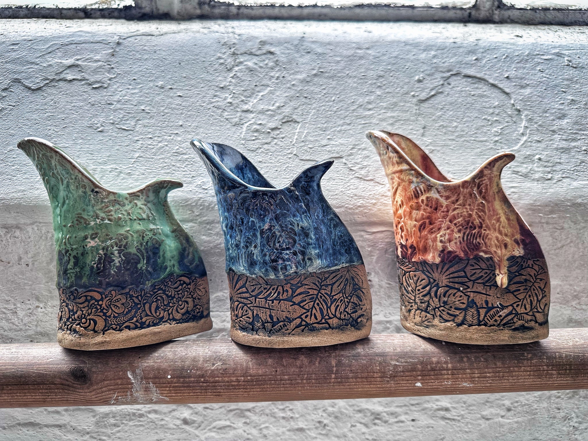 Made from stoneware clay and decorated using textured rollers and bold glaze.